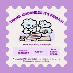 This event is only for clients of IASH SG who are currently undergoing counselling/therapy services. What is Thank Goodness It's Friday (TGIF)? A safe, pressure-free space for IASH clients to be, to wind down, to rest and be in community. No pressure, no expectations. Your presence is enough! It’s not therapy or a structured group session but a space where YOU can choose how to spend your time, whether it be on your own, with others, or quietly soaking in the atmosphere. Examples of activities we have done!: - Arts - Book reading - Movie night - And more! 📅 Fortnightly, Friday ⏱️ 7.30pm-9.30pm 📍IASH Event Space (226 Bishan St. 23) We are excited to have you on board with us! :)